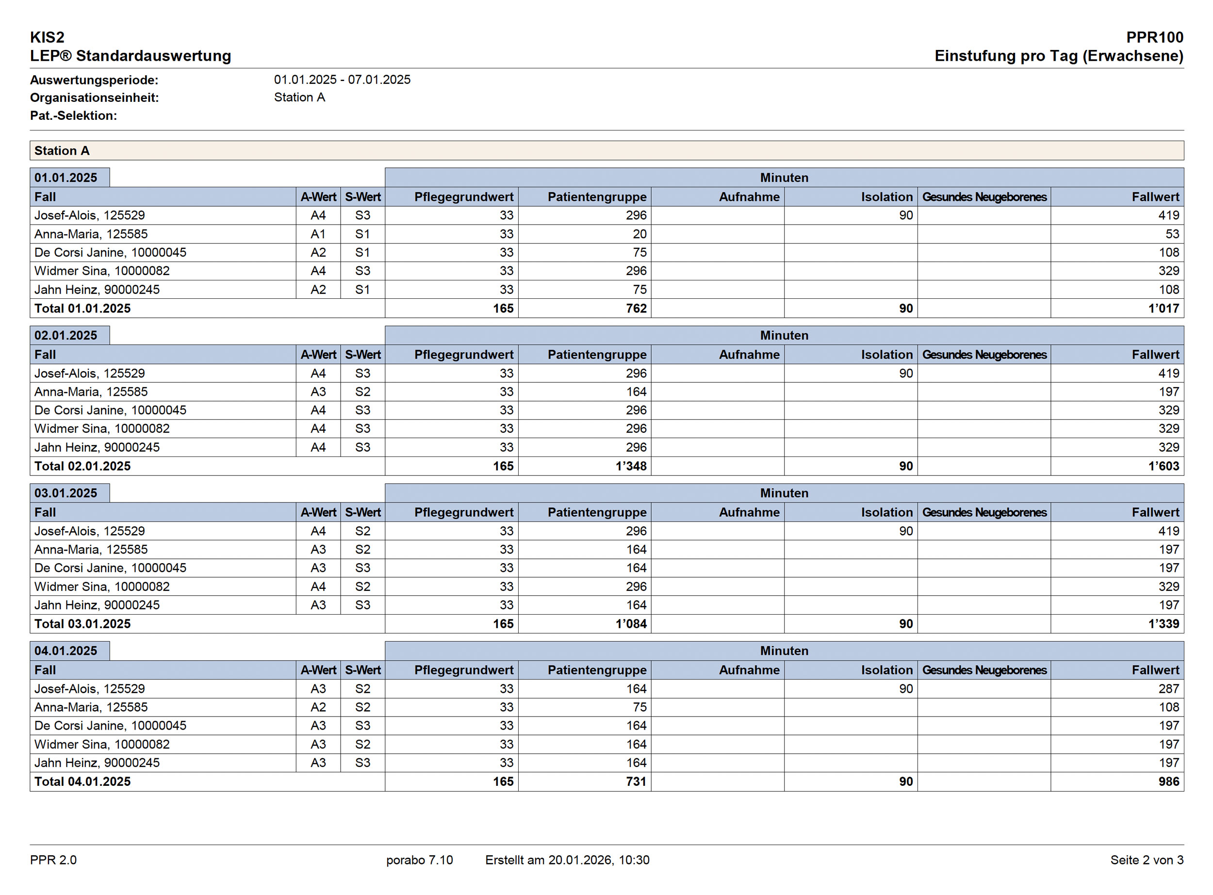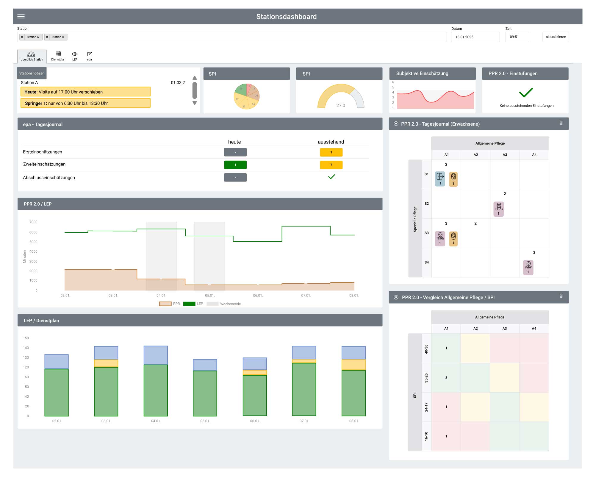 Die integrierten Funktionen umfassen eine transparente Übersicht der PPR-2.0-Einstufungen einschließlich der Identifikation fehlender Einstufungen, die Auswertung der Gesamt-PPR-Minuten pro Tag und Station mit Trend- und Vergleichsanalysen sowie die Gegenüberstellung von PPR- und LEP-Minuten. Ergänzt wird dies durch die Berechnung des Pflegepersonal-Sollbedarfs mit Abgleich zur tatsächlichen Planung und Besetzung sowie durch standardisierte Berichte, flexible Datenanalysen und einen automatisierten Reportversand.